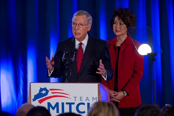 Bà Elaine Chao đứng cạnh chồng là Nghị Sĩ Mitch McConnell khi ông đọc diễn văn mừng chiến thắng tái đắc cử năm 2014 tại Kentucky. (Getty Images)