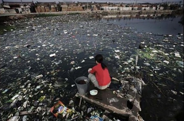 Người phụ nữ ngồi giặt giữa dòng sông đầy rác ở Trung Quốc. Ảnh: IT