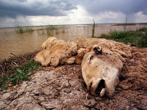 Xác một con cừu đực đang phân hủy tại đường vành công viên Quốc gia Donana (Tây Ban Nha) 1 tuần sau vụ tràn 5 triệu mét khối chất thải axit từ mỏ khai thác gần đó, khiến cho thảm thực vật bị cháy rụi và chết. – Ảnh: Reuters