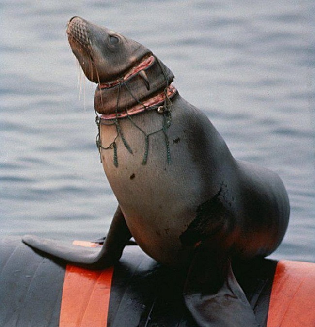Khi con người không yêu thương cả chính đồng loại của mình thì những động vật ở biển cũng chằng còn ý nghĩa gì. Khi những người đánh cá vứt những mảnh lưới không dùng nữa xuống biển, họ có nghĩ đến cảnh chú hải cẩu phải chịu đau đớn vì bị mảnh lưới đó cắt vào thịt như thế này không? Ảnh: IT