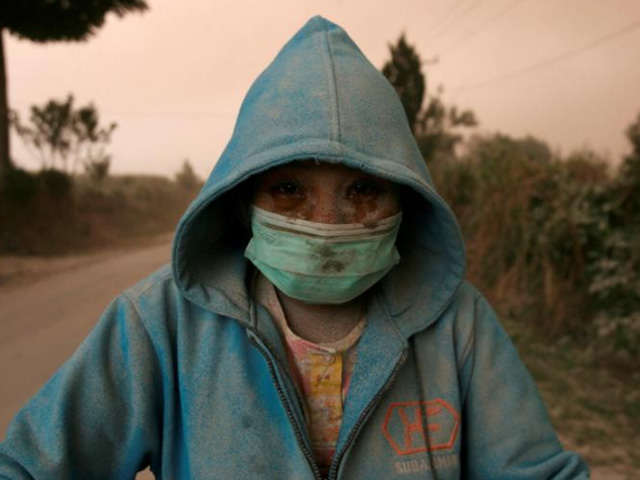 Người dân sống tại làng Beganding Village, Indonesia phải chịu ảnh hưởng nghiêm trọng từ núi lửa Sinabung phun trào. Tro bụi bủa vây toàn bộ ngôi làng, khiến cho chất lượng không khí ở nơi đây trở nên tồi tệ trong nhiều ngày. REUTERS / YT Haryono.