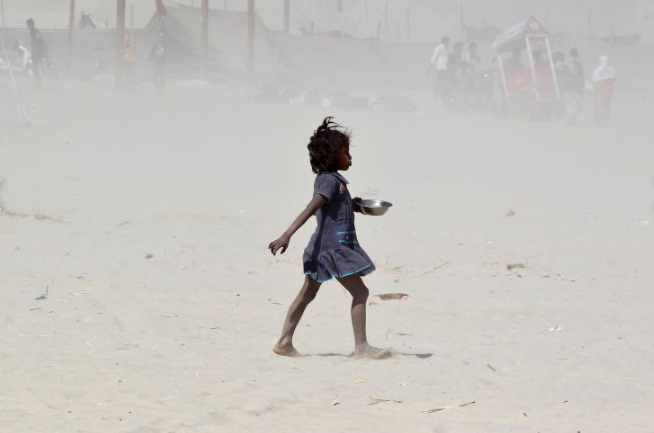 Một cô bé đi giữa cơn bão bụi bên bờ sông Ganges ở Allahabad, Ấn Độ. Ảnh: REUTERS/Jitendra Prakash.