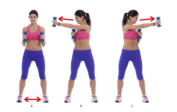 Động tác thứ hai lấy cảm hứng từ bộ môn boxing. Hai tay cầm hai quả tạ nhỏ theo chiều dọc, hai chân đứng rộng hơn một vai, lần lượt nghiêng người đấm tay thẳng sang hai bên. Thực hiện động tác 20 lần mỗi bên.