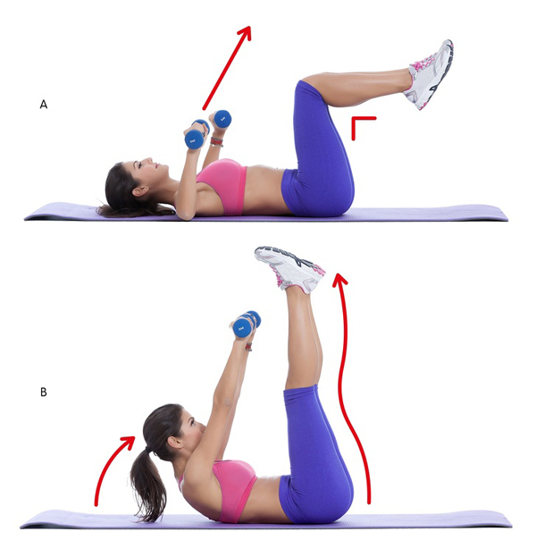 Nằm trên thảm, hai tay cầm hai quả tạ nhỏ đưa trước ngực với cánh tay chống xuống sàn, đầu gối co vuông góc, dùng cơ bụng nâng đầu lên cao, tay và chân đồng thời duỗi thẳng lên trời. Thực hiện động tác 20 lần.