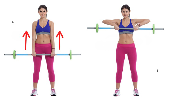 Đứng thẳng, chân mở rộng bằng một vai, hai tay cầm tạ ngang vừa sức, nâng lên cao ngang ngực 20 lần.