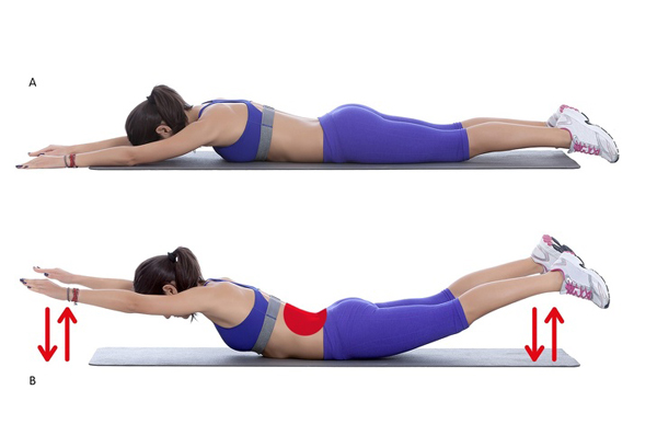 Nằm sấp trên thảm, tay và chân duỗi thẳng, úp xuống mặt thảm. Dùng cơ bụng nâng đầu, ngực, tay và chân lên cao. Thực hiện động tác 20 lần.