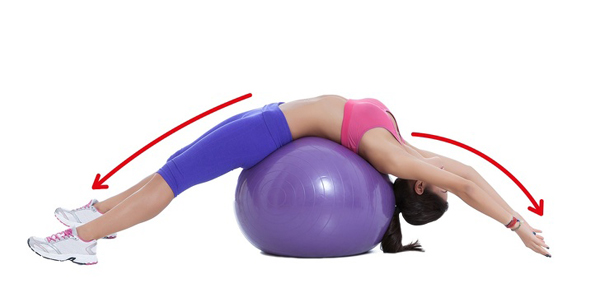 Động tác cuối cùng là kéo giãn toàn thân. Nằm ngửa trên quả bóng tập, tay và chân duỗi thẳng. Kéo giãn toàn thân trong 30 giây.