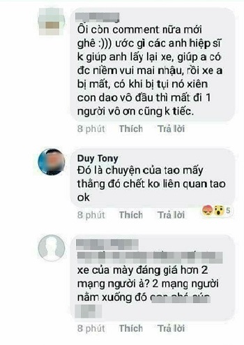 Nhiều cư dân mạng vô cùng bức xúc với hình ảnh và những lời lẽ trên facebook cá nhân của người được cho là chủ chiếc xe SH. Đa số ý kiến đều cho rằng, chủ xe SH "vô ơn" khi đăng tải những hình ảnh tươi cười, những bình luận khiếm nhã khi mà các hiệp sĩ vừa bỏ mạng vì bảo vệ tài sản cho chính anh ta.