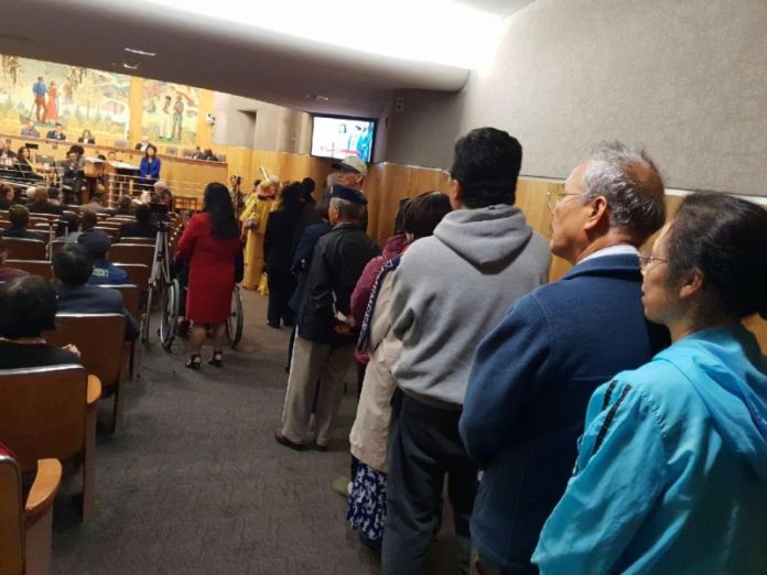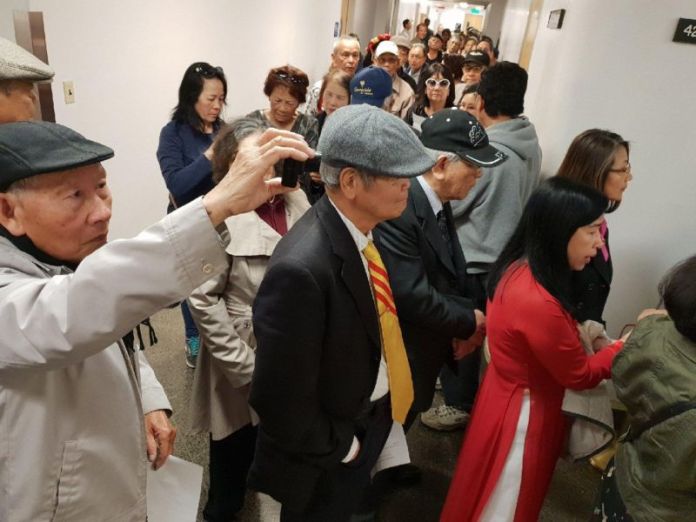 Đồng hương sắp hàng chờ lên phát biểu trước Ủy Ban Chuẩn Chi Thượng Viện về dự luật SB 895 (Hình: Đằng-Giao/Người Việt)