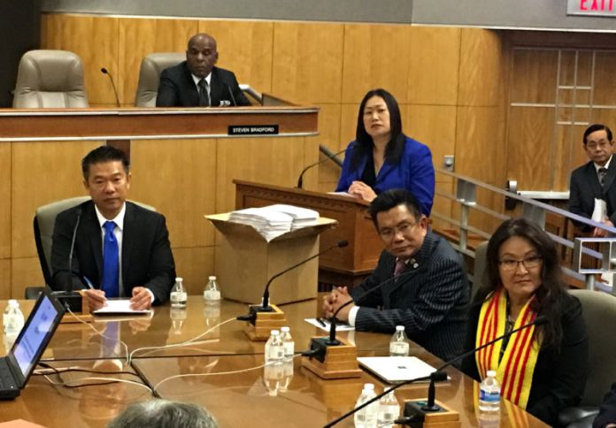 Thượng Nghị Sĩ Janet Nguyễn trong phiên điều trần trước Ủy Ban Chuẩn Chi Thượng Viện về dự luật SB 895 (Hình: Dân Huỳnh)