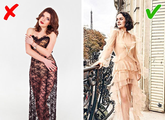Mốt váy xuyên thấu đã thịnh hành từ nhiều năm trước đây. Đến nay, item này vẫn là lựa chọn được ưu ái diện đến thảm đỏ của các ngôi sao. Tuy nhiên, đây không phải loại trang phục dành cho số đông. Việc ứng dụng trang phục này không đúng nơi, đúng chỗ sẽ khiến bạn bị gắn mác thô tục, bất lịch sự. Thay vào đó bạn nên thử sang các dáng váy suông, váy đuôi cá hoặc váy có phần tà bất đối xứng.