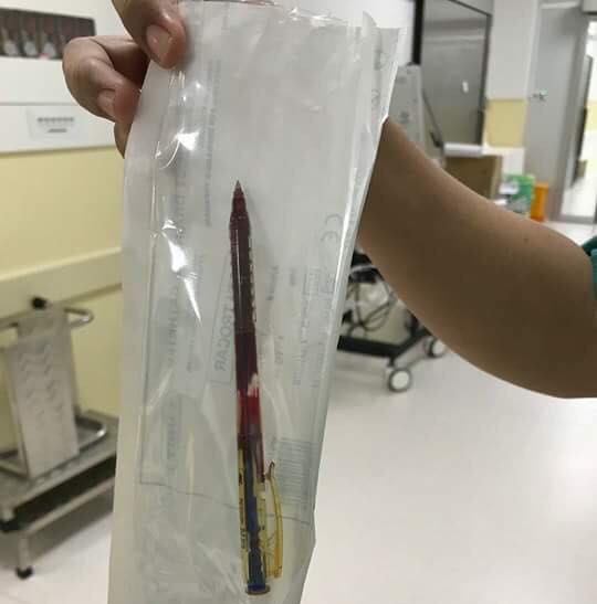 Các bác sĩ nhanh chóng đã chụp XQuang, CT, kết quả cho thấy cây bút đâm gần lút cán, rách màng phổi, mũi bút nằm ngay giữa trung thất ở trung tâm lồng ngực. Cây bút vừa xuyên thủng tĩnh mạch chủ trên, nhưng may mắn chưa gây vỡ tĩnh mạch chủ. Ngay lập tức, bệnh nhi đã được mổ cấp cứu, lấy cây bút ra.