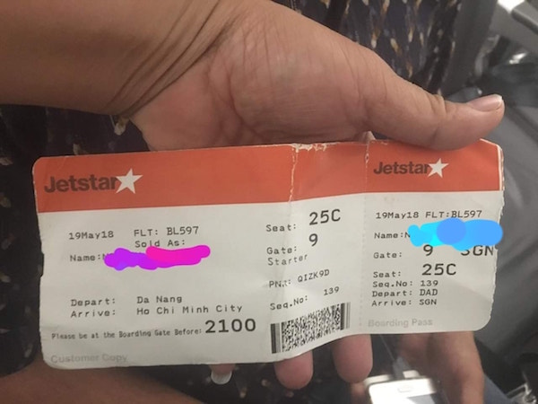 Chú thích: 1-Thẻ của đại diện hãng Jetstar- người lập biên bản phạt hành chính hành khách. 2-Chiếc vé chưa xé cuống của 1 trong các hành khách. (Tôi ẩn tên cả 2 đến khi sự việc rõ ràng).