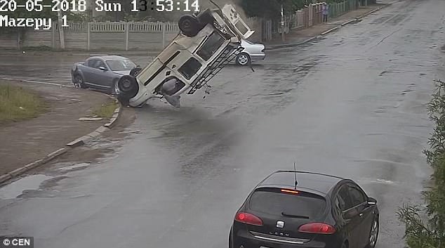 Vụ tai nạn xảy ra ngày 20.5 tại thành phố Kolomyia thuộc vùng Ivano-Frankivsk Oblast region, Ukraine. Đoạn video do camera giám sát giao thông ghi lại cho thấy chiếc xe Fiat Doblo đang chuyển qua một ngã tư, thì bị một chiếc xe Mercedes màu bạc bất ngờ đâm vào sườn.