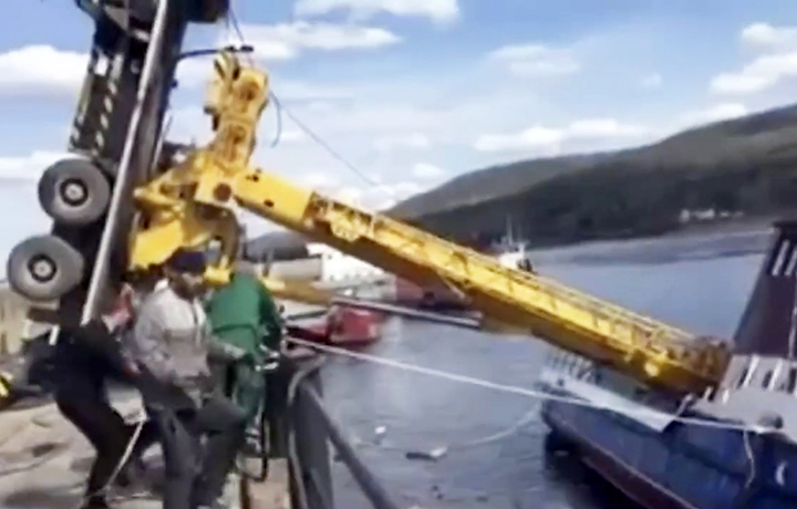 Chiếc cần cẩu bất ngờ bị kéo xuống nước khiến nhiều người vô cùng bất ngờ. Được biết sự việc diễn ra tại sông Lena. Chiếc cần cẩu này đang cố hạ thủy một chiếc tàu.