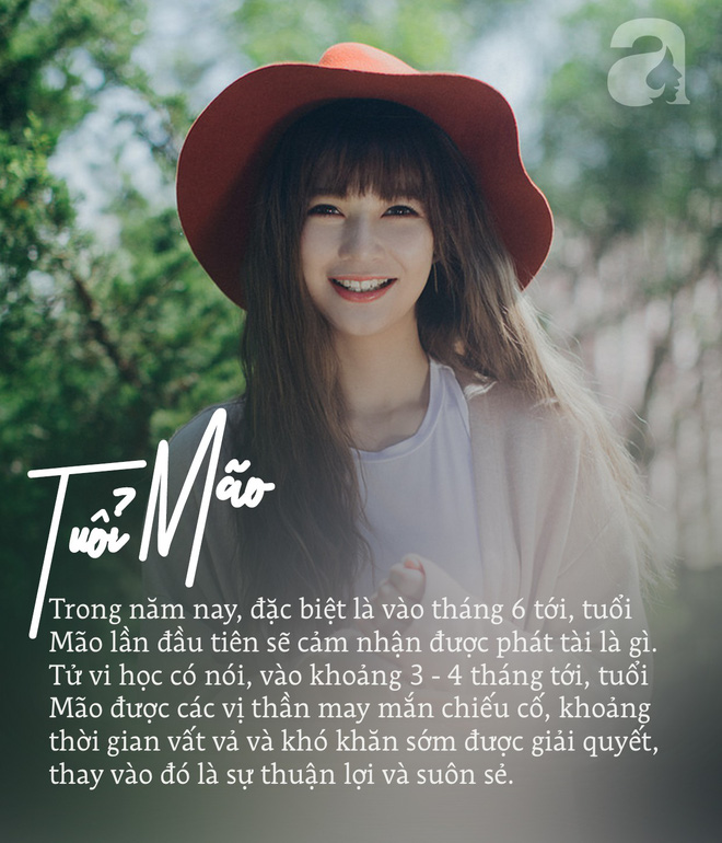 Bên cạnh đó, tuổi Mão có suy nghĩ khá bảo thủ, đôi lúc không đủ dũng cảm đương đầu với những thử thách vì vậy họ đã bỏ lỡ qua nhiều cơ hội tốt giúp đỡ cho sự nghiệp của mình. Tuy nhiên, trong năm nay, đặc biệt là vào tháng 6 tới, tuổi Mão lần đầu tiên sẽ cảm nhận được phát tài là gì.