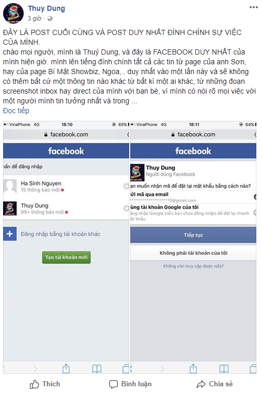 Theo đó, tài khoản này cho biết facebook cũ của T.D. hiện đã bị hack và đưa ra một vài bằng chứng khẳng định điều này. Nói về tình hình hiện tại, Facebook mới viết rằng D. vẫn ổn và rất cảm ơn ý tốt của các anh chị từ những trung tâm bảo vệ trẻ em nhưng D. xin phép từ chối. Ngoài ra, việc bố mẹ D. xin giấy chứng nhận tâm thần từ bệnh viện như những lời đồn thổi trên MXH là hoàn toàn không có thật.
