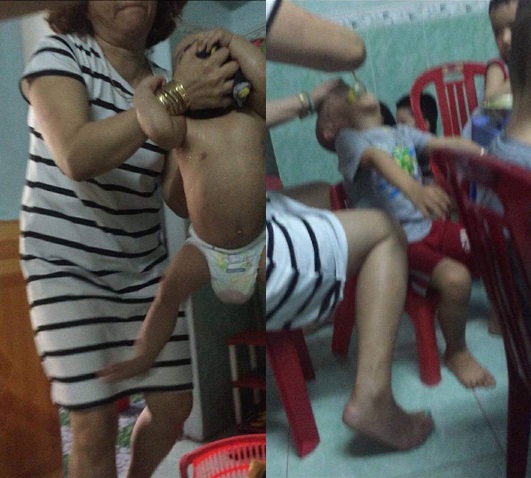 Ngoài ra, trên mạng xã hội còn chia sẻ hình ảnh ghi lại cảnh người phụ nữ dùng 2 tay bóp vào mặt đứa trẻ xách lên.