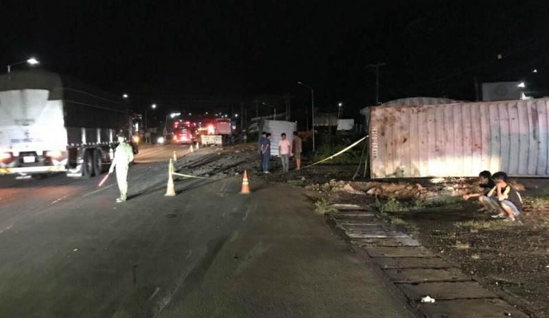 Người dân cùng lực lượng chức năng đã đập cửa đưa các nạn nhân đi cấp cứu. Sau khi tông xe khách, xe đầu kéo bị lật nghiêng ra đường.