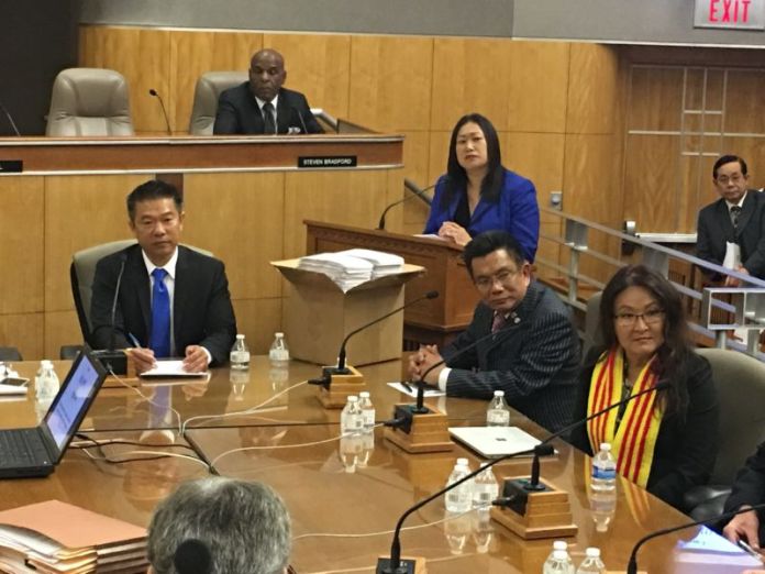 Thượng Nghị Sĩ Janet Nguyễn trong phiên điều trần trước Ủy Ban Chuẩn Chi Thượng Viện về dự luật SB 895 hôm 14 Tháng Năm 2018 (Hình: Dân Huỳnh/NV)