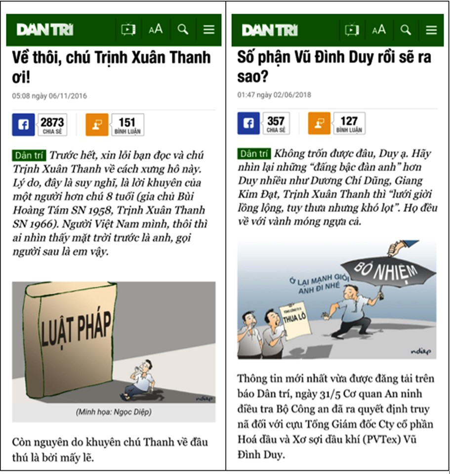 Ảnh chụp 2 bài viết trên tờ Dân Trí: „Về thôi, chú Trịnh Xuân Thanh ơi“ và bài mới nhất „Số phận Vũ Đình Duy rồi sẽ ra sao?“