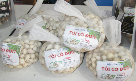 Tỏi cô đơn Lý Sơn bán tại một hội chợ nông sản ở TP HCM. Tỏi có đặc điểm màu trắng sáng, chắc mẩy, kích cỡ từ ngón tay út đến ngón tay cái, hình bầu dục.