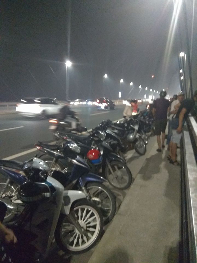 Rất đông người dừng xe máy ngay tại trên cầu để chứng kiến sự việc (Ảnh: Hoàng Tùng Lâm)