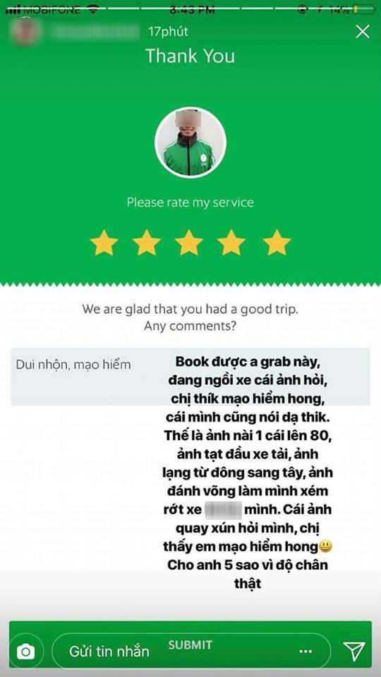 Cô bạn tên Thy - người kể lại câu chuyện này còn thật thà vào phần nhận xét tài xế và để lại đánh giá là "Vui nhộn, mạo hiểm!" nữa.