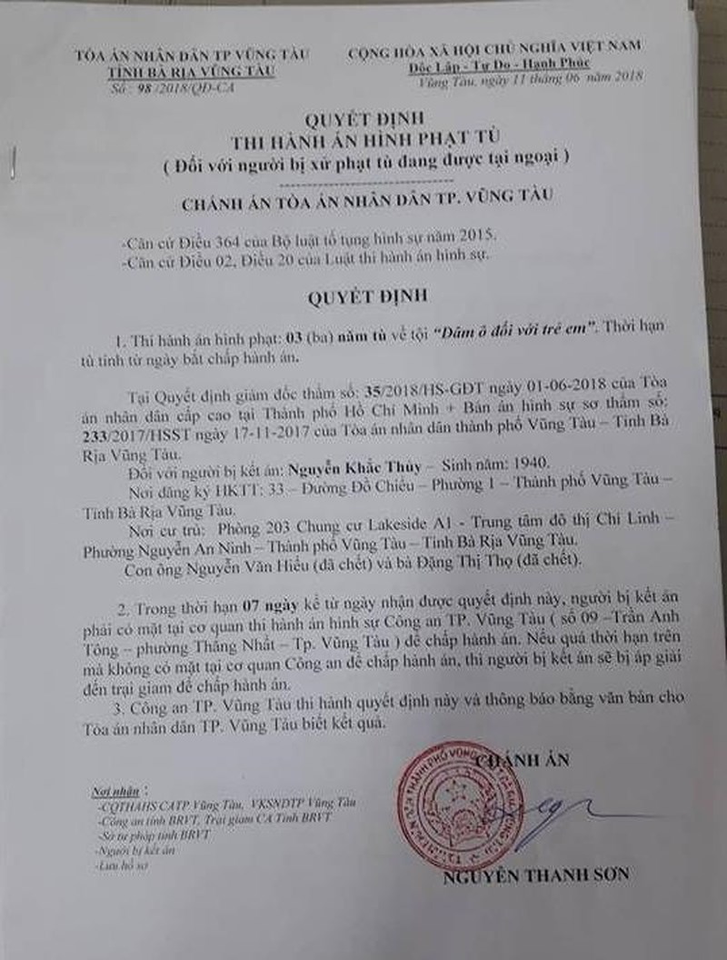 Theo tin từ TAND TP Vũng Tàu (Bà Rịa-Vũng tàu), trong sáng 11-6, tòa này đã ban hành quyết định thi hành án (THA) ba năm tù đối với Nguyễn Khắc Thủy về tội dâm ô đối với trẻ em.