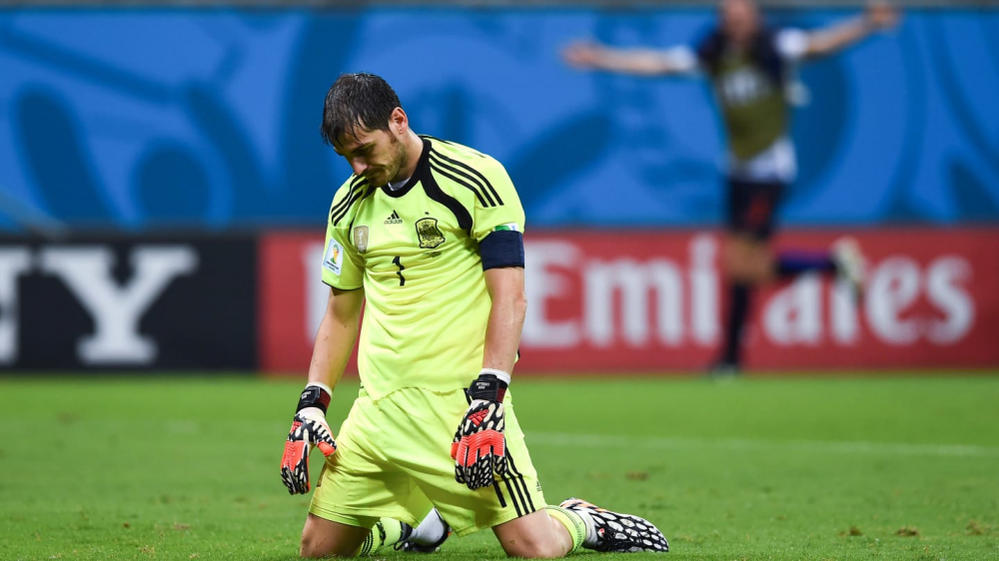 Tây Ban Nha thua ê chề tại World Cup 2014. Iker Casillas phải vào lưới nhặt bóng tới 8 lần sau 2 trận.