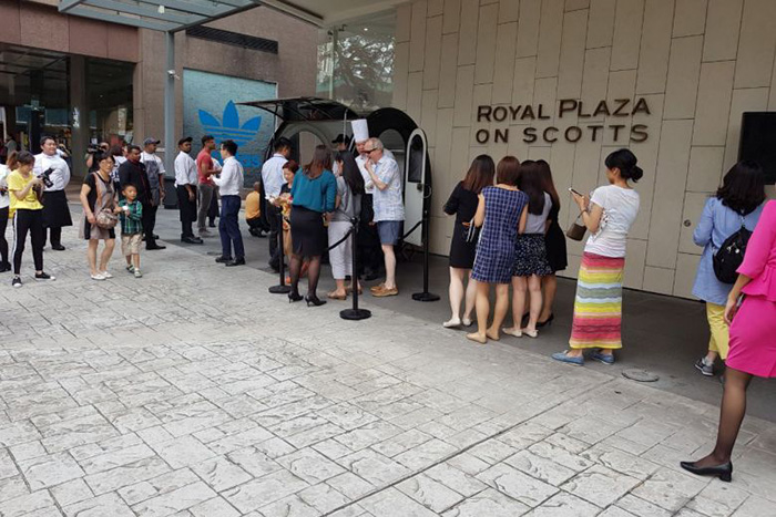 Nhiều người xếp hàng nhận bánh kẹp Trump – Kim. (Ảnh: NG JUN JIE, ROYAL PLAZA ON SCOTTS)