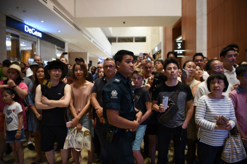 Cảnh sát Singapore đứng trước đám đông muốn quan sát Kim Jong-un tại khách sạn Marina Bay Sands ở Singapore ngày 11/6. Ảnh: AFP.