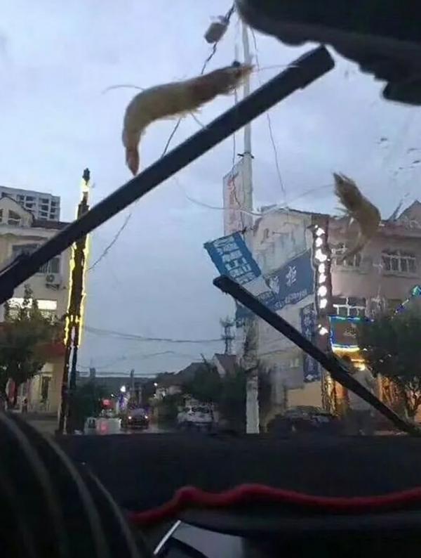 Tôm đang "leo" cần gạt nước trên ô tô. Ảnh: Weibo