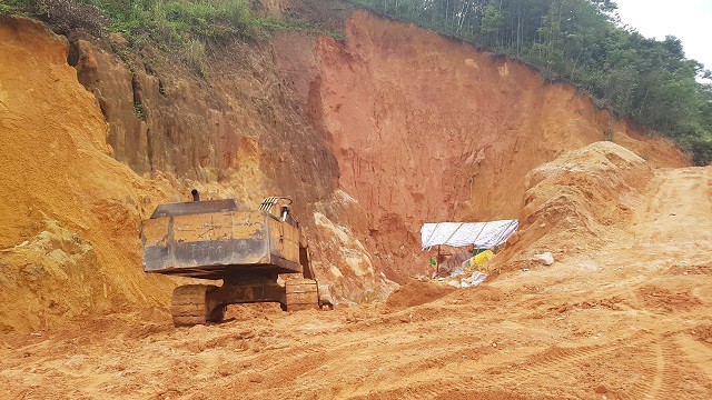 Tại thời điểm chúng tôi có mặt, hiện trường có một máy xúc đang san gạt, đào xới đất trên một quả đồi. Bên cạnh gồm 2 hố sâu khoảng 15 mét, với đường kính rộng hàng chục mét đã và đang bị đào xới.