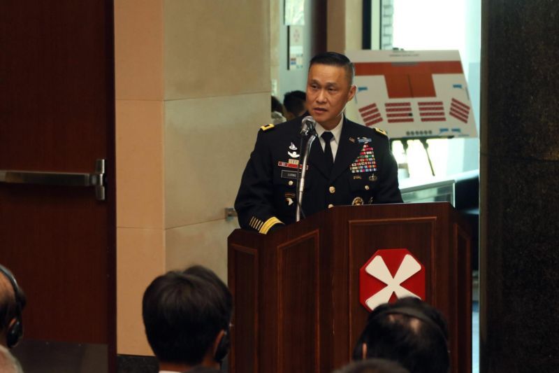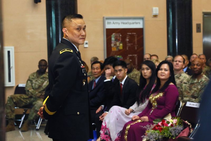 Thiếu Tướng Việt phát biểu sau khi nhậm chức và cám ơn sự ủng hộ của gia đình, đặc biệt là vợ. (Hình: Hạ Sĩ Hyun-gyu Yang/Eight Army Public Affairs)