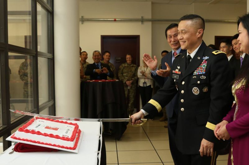Thiếu Tướng Việt vui cười cắt bánh sau khi nhậm chức, được bao quanh bởi gia đình và bạn bè. (Hình: Hạ Sĩ Hyun-gyu Yang/Eight Army Public Affairs)