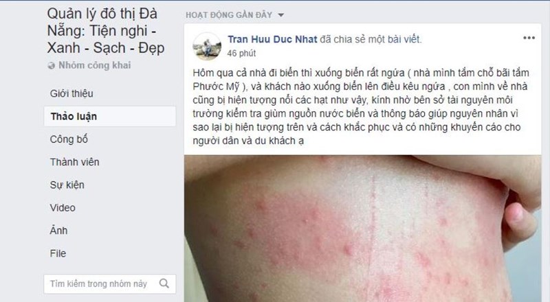 “Hôm qua cả nhà đi biển thì xuống biển rất ngứa (nhà mình tắm chỗ bãi tắm Phước Mỹ) và khách nào xuống biển lên điều kêu ngứa, con mình về nhà cũng bị hiện tượng nổi các hạt như vậy, kính nhờ bên sở tài nguyên môi trường kiểm tra giùm nguồn nước biển và thông báo giúp nguyên nhân vì sao lại bị hiện tượng trên và cách khắc phục và có những khuyến cáo cho người dân và du khách ạ” - nội dung bài đăng.