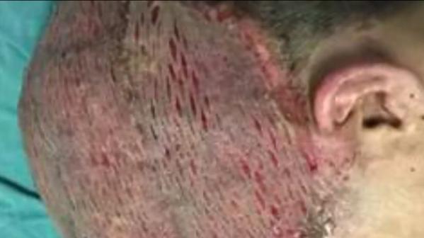 Theo lời chuẩn đoán của các bác sĩ thuộc Trung tâm Phẫu thuật thẩm mỹ của bệnh viện, H đã bị bỏng nhiệt khô 2% độ 4 vùng đầu (mức cao nhất, lan sâu đến gân, xương). Phần lớn vùng da quanh đầu đã bị hoại tử phải được cắt bỏ sau đó tiến hành ghép da tự thân.