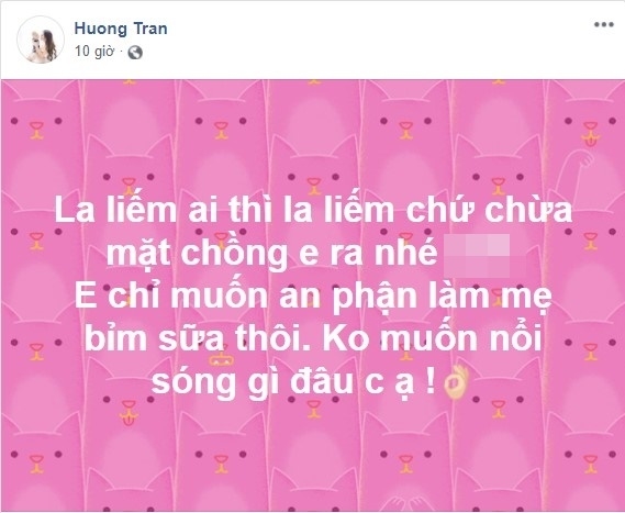 Ngay sau đó, vợ Việt Anh cũng thông qua facebook "đá xéo" các vệ tinh của chồng mình: “La liếm ai thì la liếm chứ chừa mặt chồng em ra nhé! Em chỉ muốn an phận làm mẹ bỉm sữa thôi. Không muốn nổi sóng gì đâu chị ạ!”.