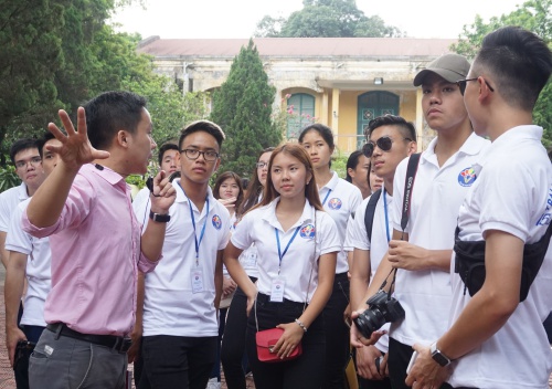 Hữu (hàng đầu, thứ hai từ trái) lắng nghe hướng dẫn viên khi thăm khu di tích Hoàng Thành Thăng Long. Ảnh: Trọng Giáp.