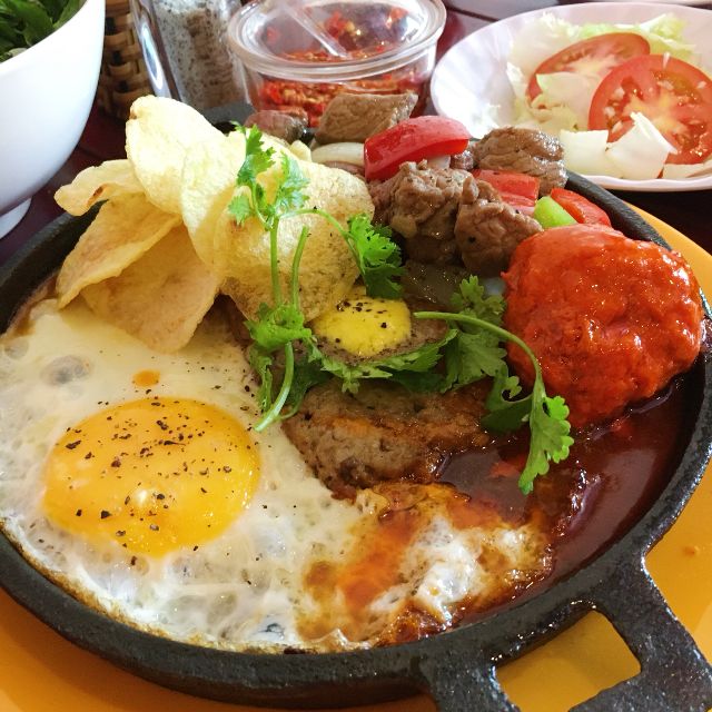 Quán ăn bình dân, đơn giản này sẽ mang đến cho bạn một chảo đầy đặn hương vị với thịt bò, chả, trứng, pa tê thịt nguội, khoai tây, xíu mại.
