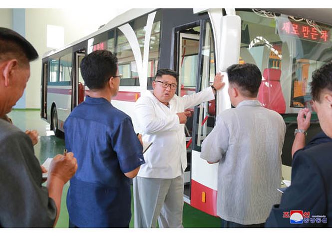 Trong chuyến thăm nhà máy xe buýt, ông Kim Jong-un được giới thiệu mẫu xe buýt mới hoàn toàn do Triều Tiên sản xuất. Ảnh: Rodong Sinmun