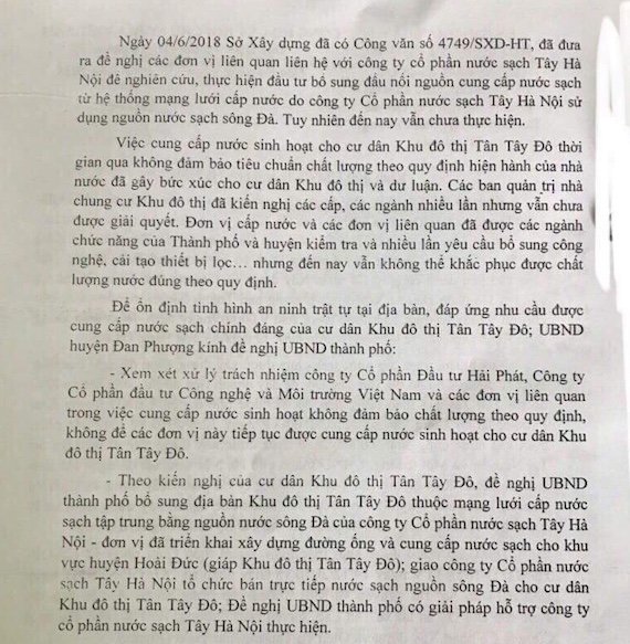 “Việc cung cấp nước sinh hoạt cho cư dân khu đô thị Tân Tây Đô thời gian qua không đảm bảo tiêu chuẩn chất lượng theo quy định hiện hành của nhà nước gây bức xúc cho cư dân nơi đây. Ban quản trị, cư dân và các cấp, các nghành đã nhiều lần kiến nghị nhưng đến nay vẫ không thể khắc phục được” - báo cáo của UBND huyện Đan Phượng nêu.