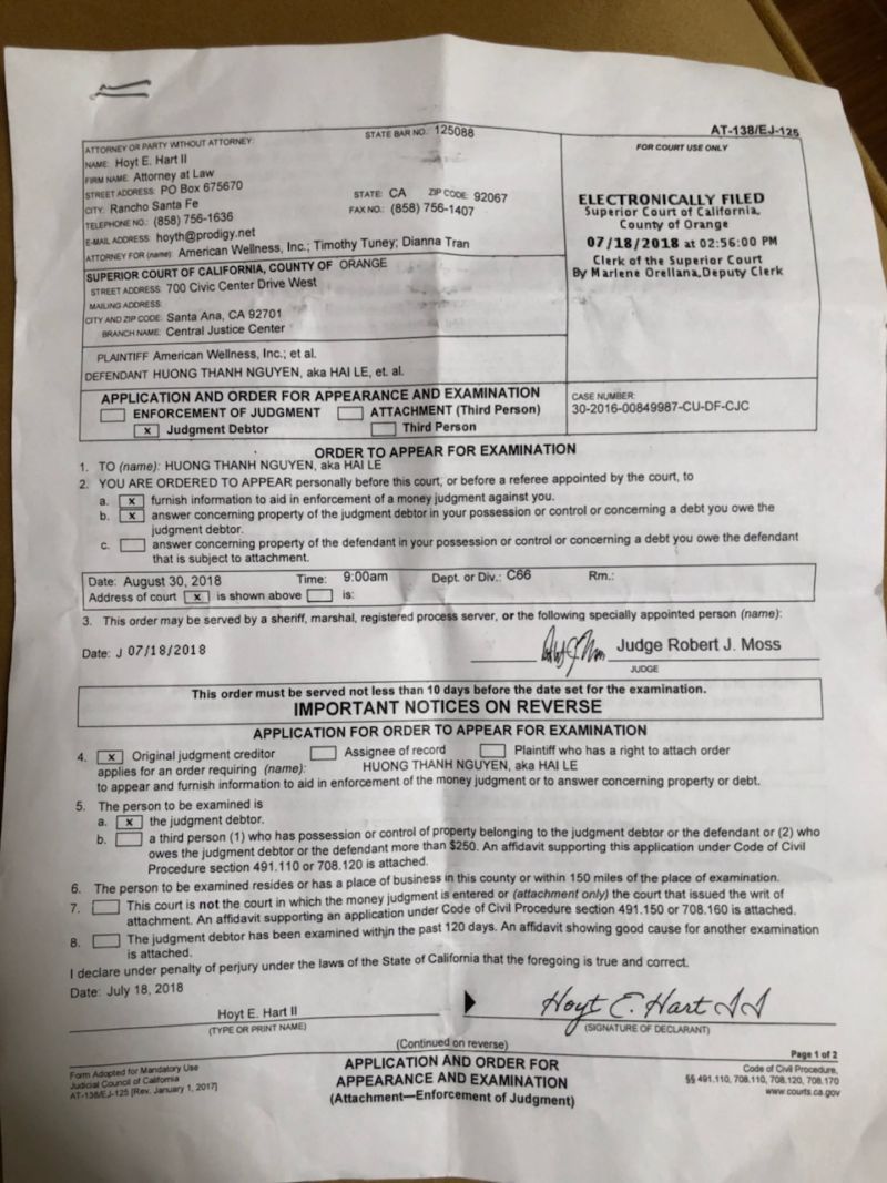 Tuy nhiên, theo h́nh chụp lại “tờ giấy quá cũ” mà Hải Lê gửi cho phóng viên Người Việt th́ đó chính là lệnh xét con nợ “Order to Appear for Examination” ṭa ban ra ngày 18 Tháng Bảy, 2018 yêu cầu Hương Thanh Nguyễn, tức Hải Lê phải có mặt tại ṭa lúc 9 giờ sáng ngày 30 Tháng Tám, 2018 để “cung cấp thông tin hỗ trợ trong việc thi hành phán quyết về số tiền mà ṭa đă tuyên”; và “trả lời những thắc mắc liên quan đến tài sản của người thua kiện để thi hành án”.