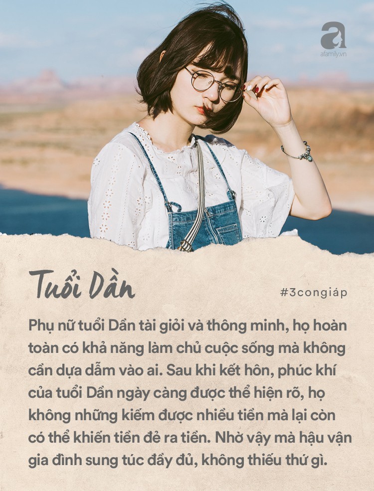 Những người tuổi Dần vốn bản lĩnh và kiên định, từng lời nói từng hành động của họ đều có thể sinh ra tài lộc. Phụ nữ tuổi Dần tài giỏi và thông minh, họ hoàn toàn có khả năng làm chủ cuộc sống mà không cần dựa dẫm vào ai. Thời trẻ, tuổi Dần luôn nung nấu trong mình ý chí cầu tiền, không chịu thua kém bất cứ ai và luôn hy vọng có thể tạo dựng một gia đình viên mãn đầy đủ.