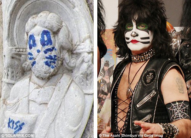 Bức tượng bằng đá hoa cương nằm cạnh thánh đường Santiago de Compostela ở vùng Galicia, miền tây bắc Tây Ban Nha, đã vừa bị vẽ nguệch ngoạc lên. Kẻ vẽ lên tượng đã... “lấy cảm hứng” từ cách hóa trang của tay trống Eric Singer trong nhóm nhạc rock của Mỹ - Kiss.