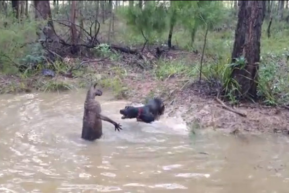 Khi chó săn màu đen lao xuống tấn công, kangaroo đã nhanh trí dùng 2 chi trước nhấn đối thủ xuống nước và khiến kẻ thù suýt bị chết đuối. Bị dìm xuống nước hai lần như vậy, chó săn dường như khiếp vía và quyết định rút lui.