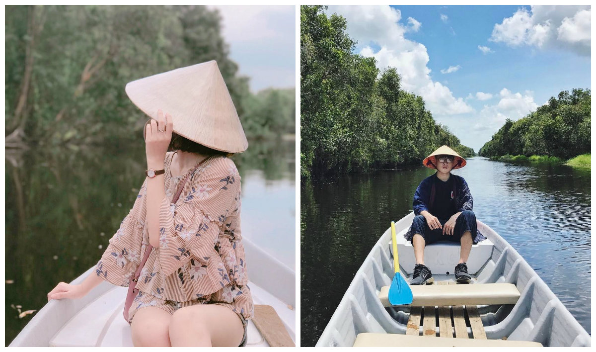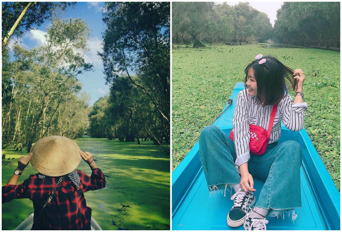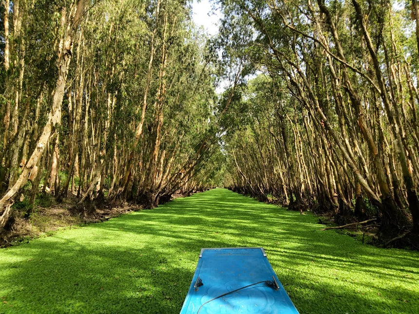 Mặt nước phủ xanh kín bèo tạo nên những hậu cảnh đẹp ngất ngây, được các tín đồ sống ảo yêu thích. Du khách được chở trên phương tiện có tên tắc ráng (tên gọi một phương tiện thủy có gắn động cơ của người miền Tây Nam Bộ) và xuồng để tham quan xuyên suốt rừng tràm. Vé tham quan rừng tràm khoảng từ 45.000-130.000 đồng/người, đi theo đoàn giá sẽ rẻ hơn. Ảnh: @