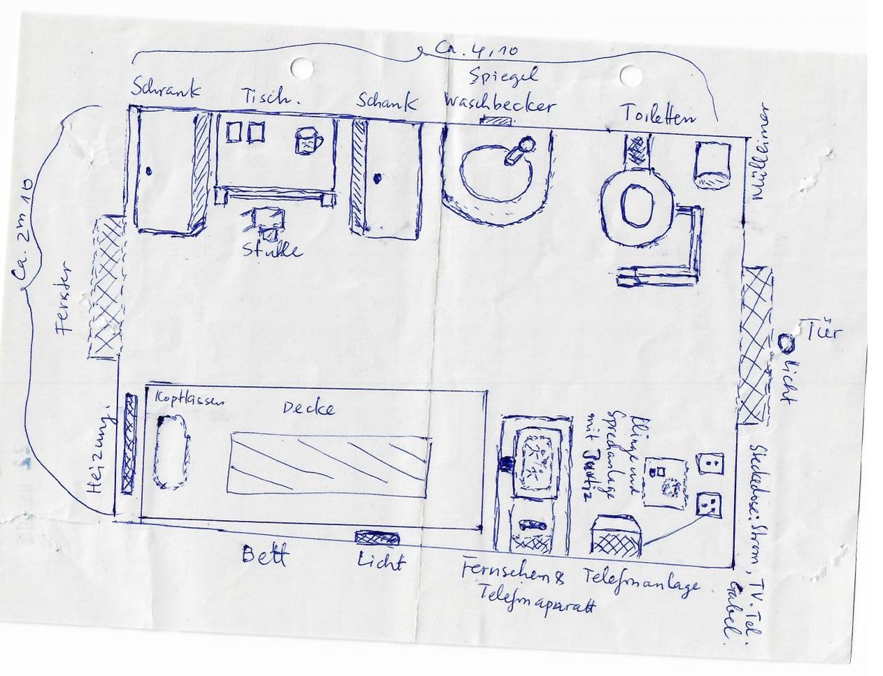 Sơ đồ buồng giam số B405 của cáo Nguyễn Hải Long tại nhà tù Moabit Berlin. Đặc biệt trong buồng giam có cả truyền hình và điện thoại. ( Hình ảnh do bạn tù người Việt cung cấp).