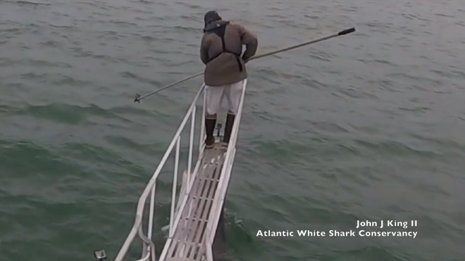 Tiến sĩ Greg Skomal, nhà nghiên cứu thuộc Bộ phận Massachusetts của Viện Hải dương học chắc chắn đã sợ hết hồn khi một con cá mập trắng vươn lên từ mặt nước, suýt thì đớp được ông khi đang đứng trên một cái cầu kim loại vươn ra mặt nước. Lúc ấy, Skomal đang quay cảnh thủy sinh dưới nước bằng một cái camera GoPro gắn trên một đầu gậy.